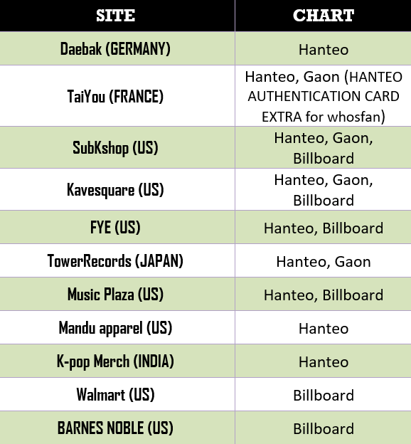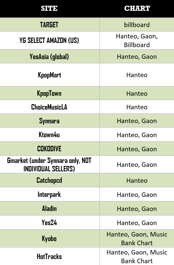 If you absolutely want to guarantee your physical album purchase counts towards Korean charts, DON'T buy from Amazon or EBay (an exception is AMAZON YG SELECT because it's an official shop by YG ENTERTAINMENT). Many storefronts or sellers claim their sales count towards Hanteo and Gaon charts even if they do not, only to boost their sales and make a lot of money.